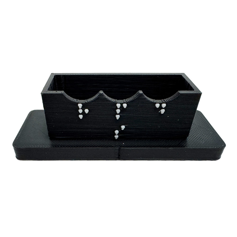 The stand is black with white braille. "R" for Record, "P/S" for Play/Stop and "D" for Delete.